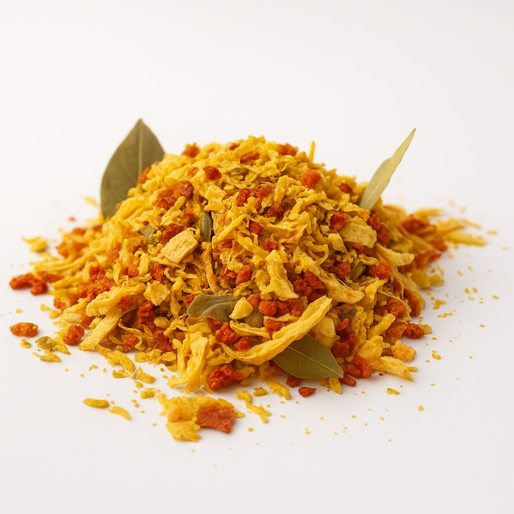 INGREDIENTES: Alho, cebola, alho em pó, cúrcuma, pimentão vermelho, pimentão verde e cenoura.